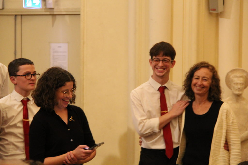 Puis est venu le temps de l’intronisation des nouveaux choristes, moment symbolique de leur entrée officielle dans la grande famille d’Anguelos. Chacun a reçu sa broche ou sa pince de cravate, marque visible de son appartenance à la chorale. Mais au-delà de ce signe distinctif, cette intronisation revêt une signification plus profonde : chaque nouveau choriste choisit un parrain ou une marraine, un ancien destiné à le guider, le soutenir et l’accompagner tout au long de sa vie de choriste. Ce lien de fraternité, propre à Anguelos, témoigne de l’importance de la transmission, de l’écoute et de la solidarité au sein du groupe.